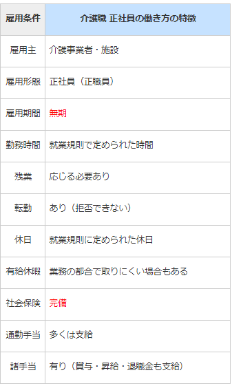1.介護職 正社員(正職員)の雇用条件の特徴